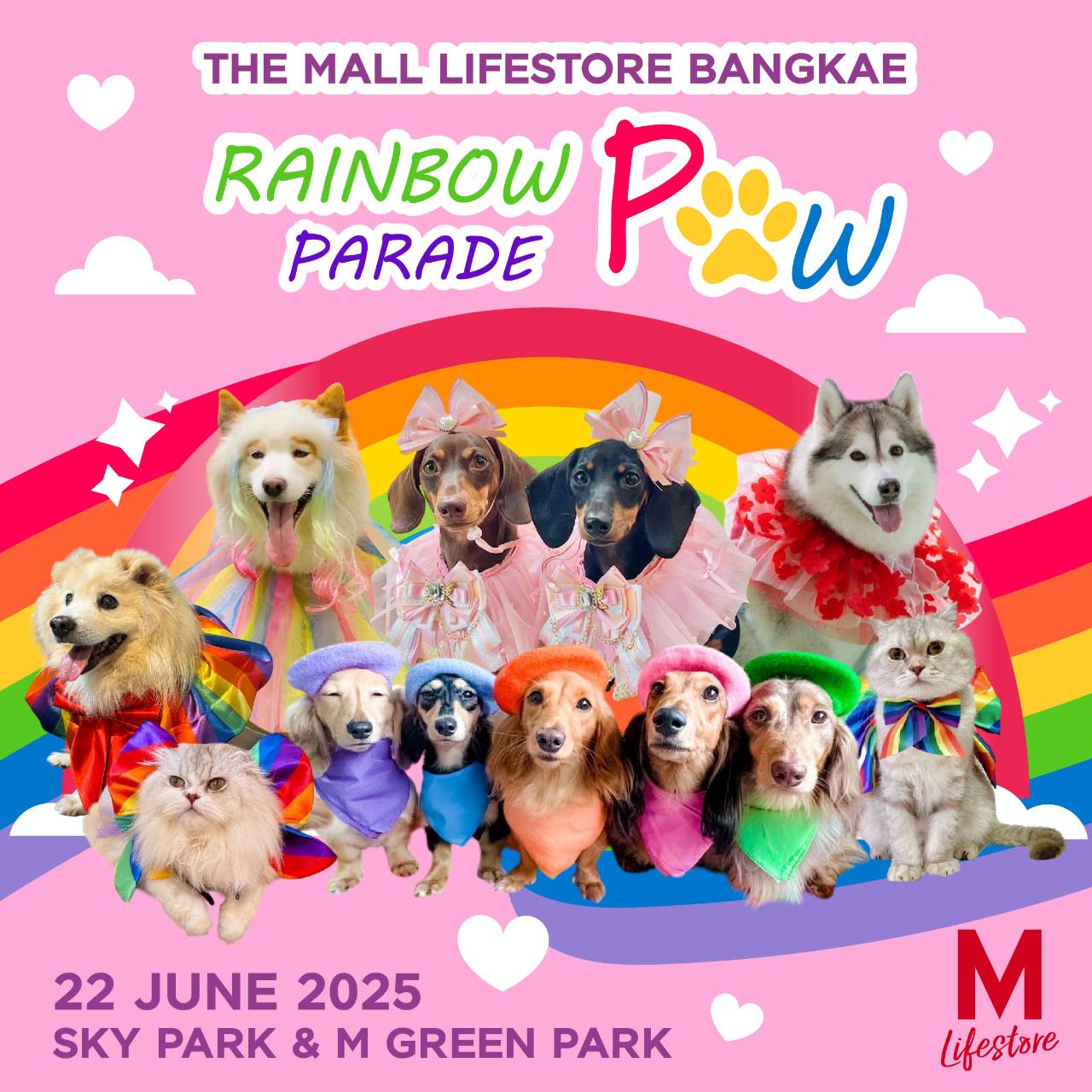 เดอะมอลล์ไลฟ์สโตร์ บางแค จัดกิจกรรมเอาใจเหล่า PET LOVERS กับขบวนพาเหรดน้องหมา และน้องแมว สุดคิวท์ในธีมหลากสีสัน บน RUNWAY สีรุ้งสดใส มาชมความน่ารักได้ในวันที่ 22 มิถุนายน 2568 ที่บริเวณ SKY PARK & M GREEN PARK