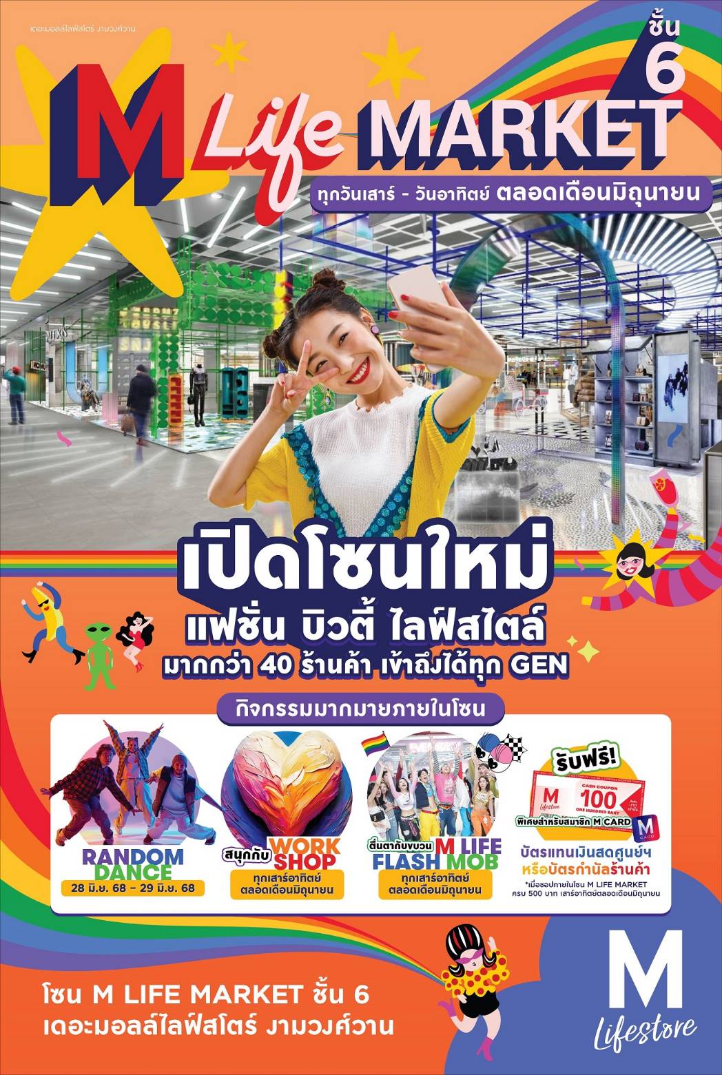 เดอะมอลล์ไลฟ์สโตร์ งามวงศ์วาน สนุกกับการช้อปในโซนใหม่ M LIFE MARKET กับสินค้าแฟชั่น บิวตี้ ไลฟ์สไตล์สุดชิค ทุกวันเสาร์อาทิตย์ ตลอดเดือนมิถุนายนนี้ พิเศษ ช้อปครบ 500 บาท รับ CASH COUPON ศูนย์การค้า มูลค่า 100 บาท (จำนวนจำกัด) หรือ บัตรกำนัลร้านค้าภายในศูนย์ฯ และพิเศษ ฉลอง PRIDE MONTH ร่วมกิจกรรมเวิร์กช็อปสีสันสุด PRIDE ที่บริเวณ M LIFE MARKET ชั้น 6 และสนุกไปกับ M LIFE PARADE FLASH MOB ที่มามอบความสุขทั่วทั้งศูนย์การค้า