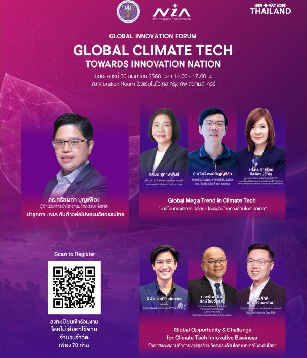 สำนักงานนวัตกรรมแห่งชาติ (NIA) ขอเชิญผู้สนใจเข้าร่วมงาน Global Innovation Forum 2025 ภายใต้แนวคิด “Climate Tech towards Innovation Nation” เวทีสำคัญในการแลกเปลี่ยนความรู้และมุมมองระดับโลกด้าน Climate Tech เพื่อร่วมกันผลักดันนวัตกรรมไทยสู่การเป็นผู้นำในระดับสากล